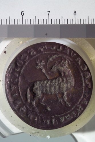 sigillo in bronzo con raffigurazione dell'Agnello e iscrizione illeggibile.