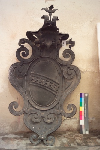 stemma metallico della famiglia patrizia veneziana dei Gradenigo. Presenta corpo con volute barocche ai margini e termina sulla parte sommitale con fiorami e giglio ora ripiegato verso il basso.