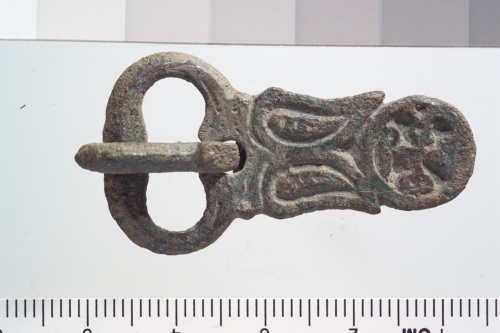 fibbia terminante con decorazione a croce entro piccolo tondo e due foglie accostate.
