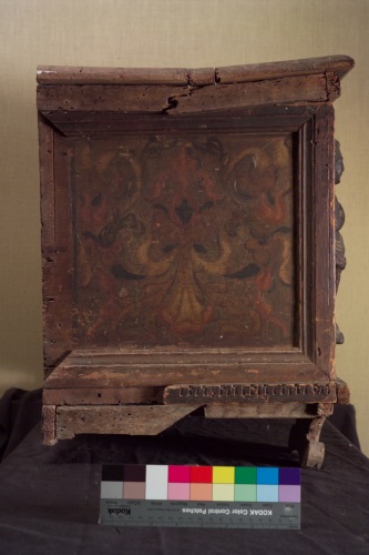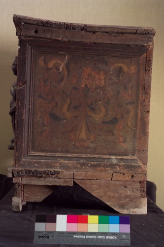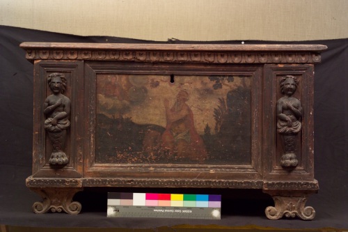 Cassapanca in noce ornata ai lati del pannello centrale da due cariatidi lignee. Presenta una specchiatura centrale raffigurante San Girolamo in paesaggio silvestre nel'atto di pregare la Vergine che appare tra nubi nell'angolo superiore sinistro, dipinta a olio.