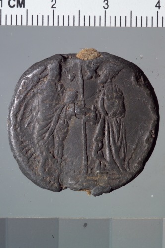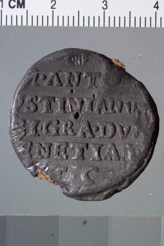 bolla plumbea del doge Marcantonio Giustinian. Reca sul recto San Marco, a sinistra, regge con la destra un vessillo mentre il doge, a destra, reso di profilo e più piccolo del santo, regge l'asta del vessillo con la sinistra.