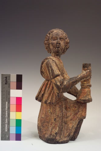 : Scultura lignea dorata raffigurante un angioletto reggicandelabro.