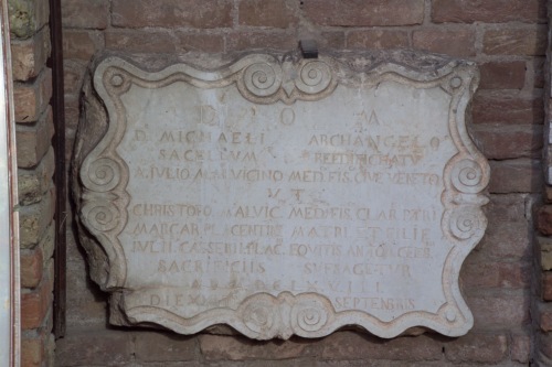 Lapide in marmo riportante un'iscrizione entro una cornice mistilinea a volute.