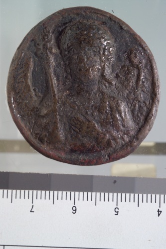 Medaglione in bronzo con figura di angelo a mezzo busto in posizione frontale, probabile decorazione di calice o di altro arredo liturgico. L'angelo tiene in mano una verga/spada (si tratta forse dell'Arcangelo Michele?).