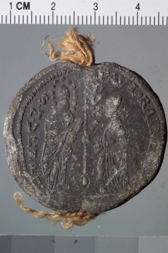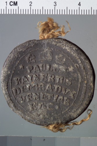 bolla plumbea del doge Paolo Renier. Reca sul recto San Marco, a sinistra, regge con la destra un vessillo mentre il doge, a destra, reso di profilo e più piccolo del santo, regge l'asta del vessillo con la sinistra.