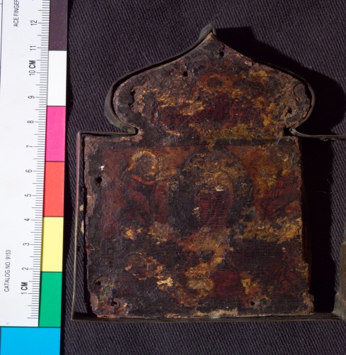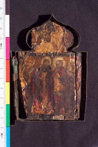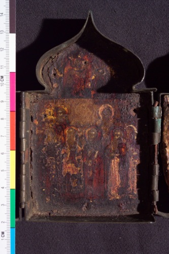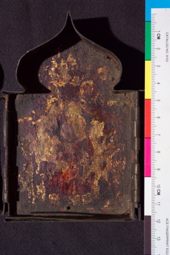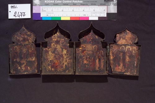 Polittico ogivale a quattro scomparti uniti da cerniere, con contorno in ottone e tavolette con scene della vita di Cristo dorate. Tracce di iscrizioni.