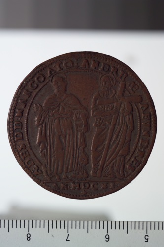 Medaglia in bronzo commemorativa della ricostruzione della chiesa dei Santi Marco e Andrea di Murano. Sul recto sta la effigie dei due santi e sul recto un'iscrizione. Datata MDCXI.