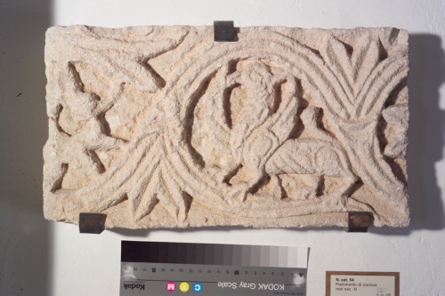 frammento di fregio orizzontale / cornice marcapiano. Presenta decorazione a tralcio abitato reso da trivimine che dopo la diramazione, sottolineata da un solco ortogonale, si divide in desinenza secondaria arrovesciata verso l'interno su cui poggia l'animale (un grifone alato le cui membra e caratterizzazioni sono definite da solchi) e tralcio principale dall'andamento sinusoidale. Nello spazio triangolare di risulta tra le diramazioni sono collocate due foglie appuntite con solco centrale. Queste, con i solchi del tralcio determinano un motivo ad angoli inscritti. Gli spazi determinati dal tralcio prima e dopo lo zoomorfo sono frammentati ma sono sicuramente occupati da elementi fitomorfici.