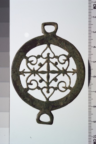 borchia a traforo con decorazione a croce iscritta e occhielli cuoriformi.
