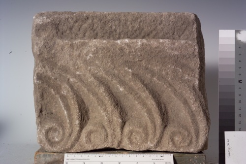 la fascia inferiore di spessore minore costituisce probabilmente uno scanso per l'incastro su una struttura sottostante. Come nel pezzo inv. n. 663 del museo stesso, qui c'è la tendenza a snellire i cani correnti e a segnarli con decise solcature lungo gli steli e all'interno delle volute. La qualità tecnica realizzazione è però ben diversa. Nel reperto in esame i singoli elementi appaiono irregolari e approssimativi.