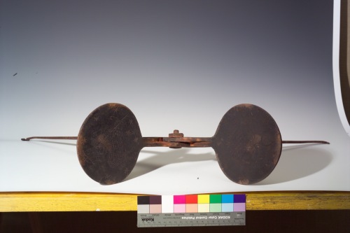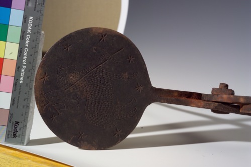 stampo a matrice circolare in ferro con lunghe braccia a tenaglia per ostie. Un lato della matrice presenta una decorazione con al centro un agnello (Agnus Dei) circondato da stelle. Sull'altro lato un grande fiore con foglie cuoriformi circondato da stelle.
