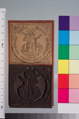 Sigillo in bronzo con raffigurazione di Santa Maria Assunta. E' presente un'iscrizione che corre in senso circolare lungo il diametro del sigillo.