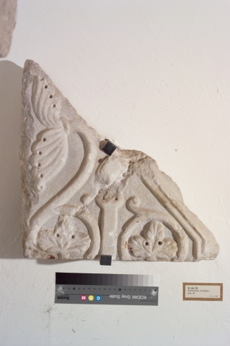 Frammento di pluteo, probabilmente con funzione di parapetto. » leggibile la decorazione fitomorfica a tralci disposta simmetricamente ai lati di un candelabro ed inclusa tra due listelli che piegandosi ad angolo ottuso fanno propendere per linterpretazione del motivo come campo centrale di una lastra trapezoidale.