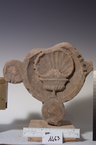 Tondo contornato da volute intrecciate, due delle quali mancanti al centro del tondo conchiglia posta su calice bacellato.