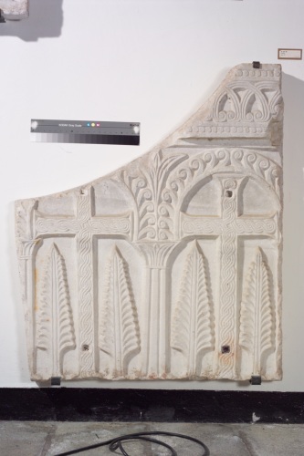 nella parte superiore, tra due cornici bisulcate con file sesquipedali di perline nel settore centrale, come un motivo ad archetti intrecciati, triviminei e ad estremità arricciate. Al di sotto di questo motivo lo spazio è scandito da due archi con motivo a gattoni, separati da un grosso giglio e sorretti da tre colonne di cui solo quella centrale integra; la colonna centrale appare solcata da due linee rette verticali. Il capitello, provvisto di collarino, è decorato con un motivo gigliato. Lo spazio delle arcate è occupato da due croci latine ad estremità patenti e con bordo al cui interno è ospitata una matassa. Ai lati dei due bracci inferiori delle croci si ergono due cipressi.
