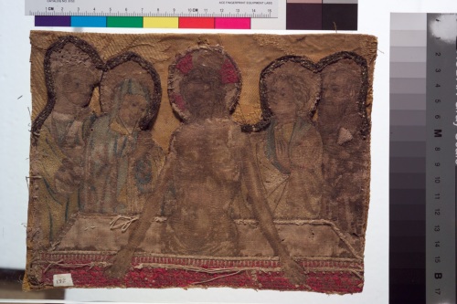 il ricamo del sec. XV è incollato su un supporto di damasco giallo con elementi fitomorfi, databile alla fine del sec. XVIII. Probabilmente faceva parte della decorazione di un paramento liturgico, ad esempio lo stolone di un piviale. La presenza, comunque scarsa, di metallo membranaceo conferma che si tratta di un manufatto quattrocentesco italiano, ma rende difficile lattribuzione a manifattura veneziana.