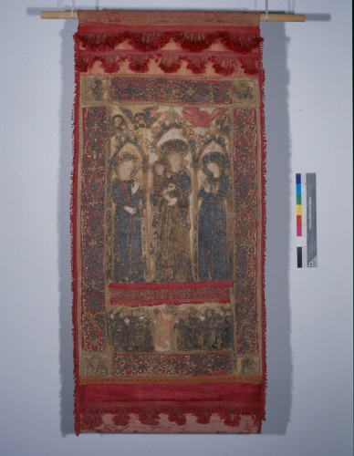 Il ricamo su due lati è simile ma non identico: rappresenta la Madonna con bambino tra S. Fosca e S. Maura (?), con quattro cherubini nella parte alta e due gruppi di 6/7 confratelli in processione nella parte bassa. Nei riquadri angolari figurano i simboli dei quattro evangelisti. I restauri ottocenteschi e le pessime condizioni di conservazione rendono difficile attribuire il manufatto ad una scuola precisa, ma presenza di oro e argento lamellari lo rendono simile ad altri gonfaloni veneziani della stessa epoca