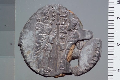 bolla plumbea del doge Paolo GRimani. Reca sul recto San Marco, a sinistra, regge con la destra un vessillo mentre il doge, a destra, reso di profilo e pi˘ piccolo del santo, regge l'asta del vessillo con la sinistra.