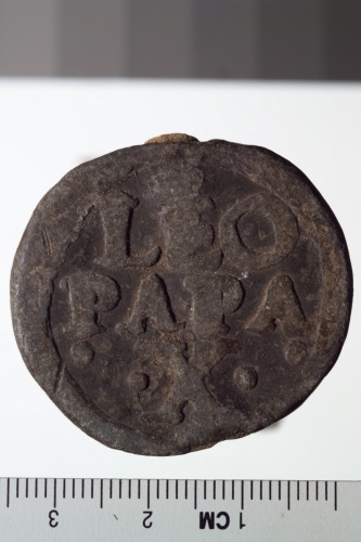 bolla di Leone X Papa. Sul recto le teste dei santi Pietro e Paolo, ciascuna aureolata da un arco di globetti che si uniscono a quelli del contorno, separate da una croce astile.