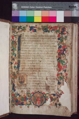 Il manoscritto contiene gli statuti o mariegola della confraternita di Sant'Urbano di Burano da Mar. Nel testo della prima carta Ë riportata la data di fondazione della confraternita (1348). Tuttavia il codice fu esemplato e miniato in un momento posteriore come spesso accade ai libri di statuti. Infatti la scrittura Ë senz'altro del primo quattrocento e il fregio acantiforme risponde pure alle consuetudini decorative del primo quattrocento veneziano. L'immagine di Sant'Urbano, raffigurato come vescovo e affiancato da due santi che potrebbero identificarsi con Cecilia e Valeriano (L. Reau), puÚ essere avvicinata a prodotti di miniatura padovani degli anni venti del quattrocento quali ad esempio gli statuti dei Notai di Padova (Padova, Biblioteca Civica, ms BP339) attribuito dalla critica al Maestro di Roncaiette.