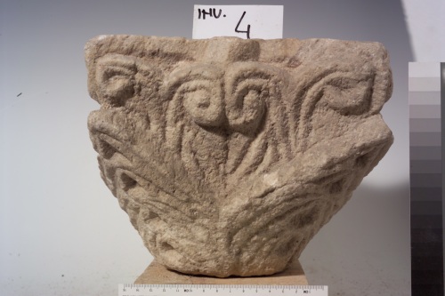 una corona di quattro grandi foglie angolari e lanceolate avvolgono la base del capitello. Le foglie sono inoltre attraversate da profonde solcature che ne disegnano le venature. Dalle foglie nascono due rozzi tralci bisulcati che poi si dividono ciascuno in due caulicoli divergenti e tangenti il sottile abaco. Essi terminano con una voluta: le volute interne vanno a toccarsi, mentre quelle esterne si dirigono verso gli spigoli del capitello.