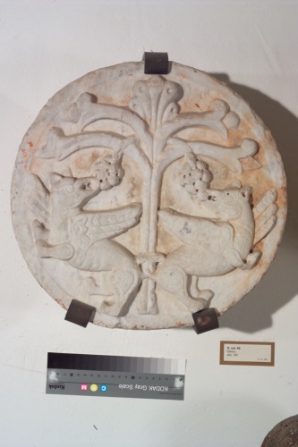 patera con al centro un alto albero echeggiante una palma che presenta un tronco diviso da un solco in due sezioni verticali e una chioma costituita da due lunghe foglie per parte e da un motivo sommitale centrale suddiviso in cinque lobi. Da entrambi i lati, tra la prima e la seconda foglia, fuoriesce un tralcio da cui penzolano due grappoli (di datteri?). Ai piedi dell'albero due grifoni rampanti rivolti verso l'esterno girano la testa all'indietro per cibarsi dei due grappoli.