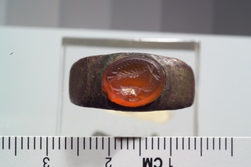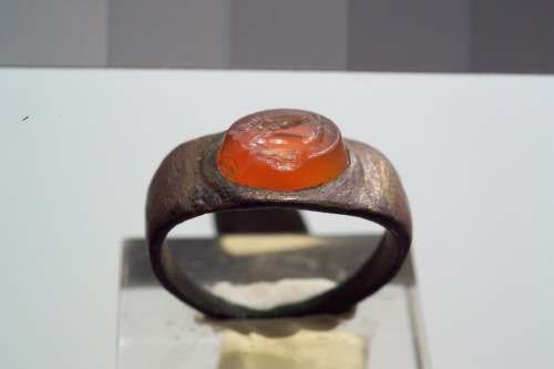anello in bronzo con castone in pietra d'onice con incisi due pesci.
