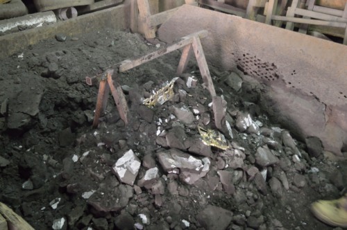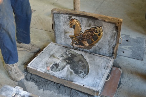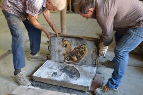 Loperazione della sformatura si svolge in un angolo dellambiente adibito alla fusione in staffa, delimitato da alcune assi di legno, al centro del quale è un piccolo cavalletto. Qui i getti, una volta solidificati e raffreddati, dopo circa 20 minuti, vengono estratti dalle forme. Queste ultime vengono dapprima aperte e poi sformate appoggiandole e battendole, se necessario, lungo i bordi, del cavalletto. Man mano che i getti vengono estratti, sono collocati alla rinfusa entro una carriola posta a lato della zona della sformatura.