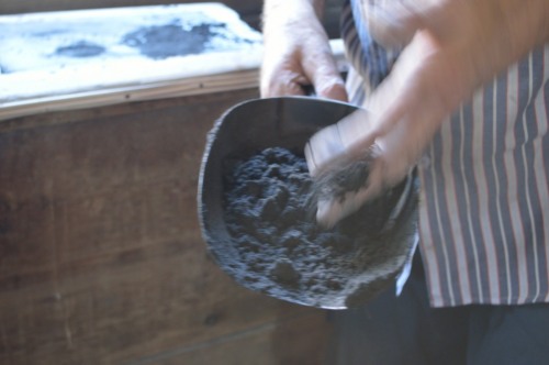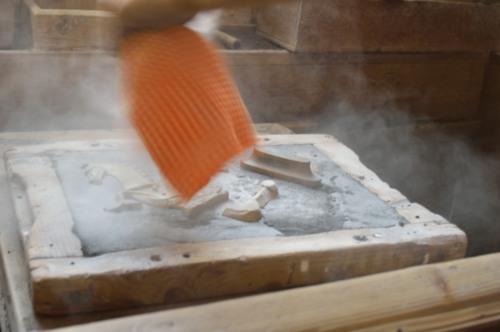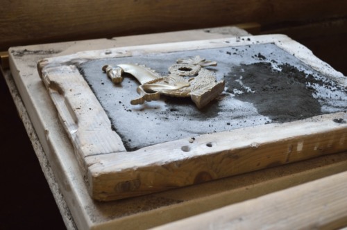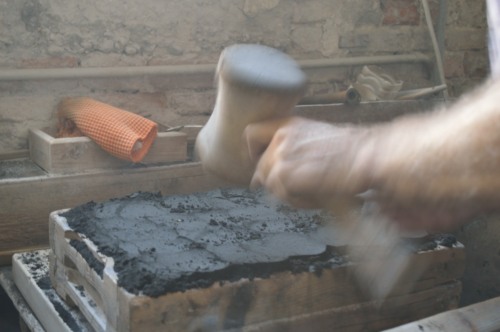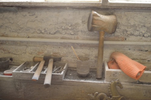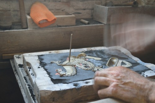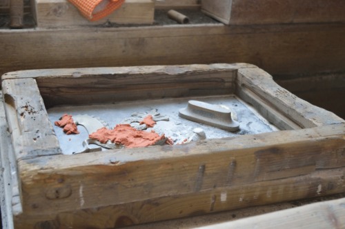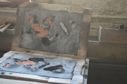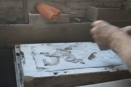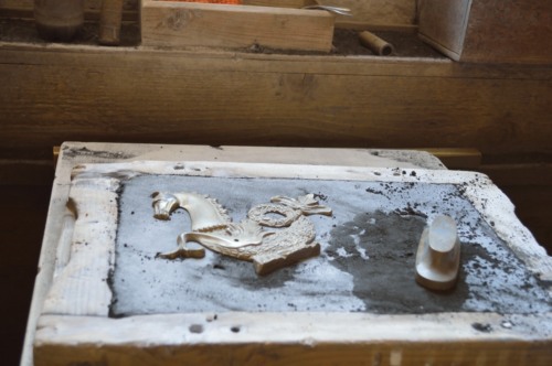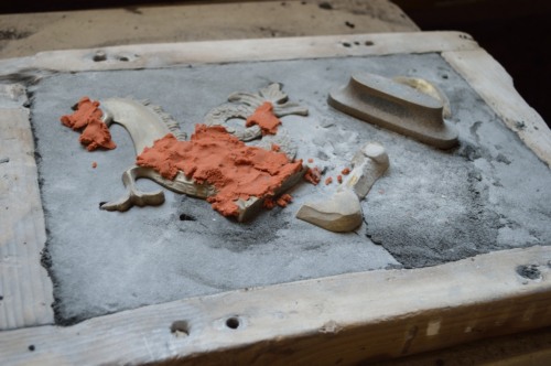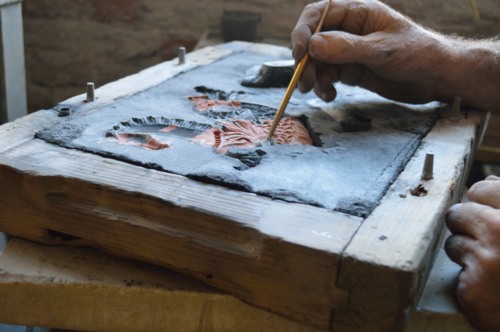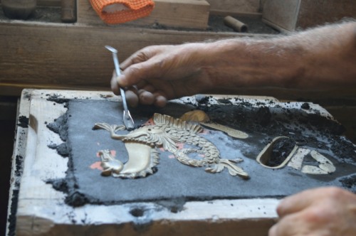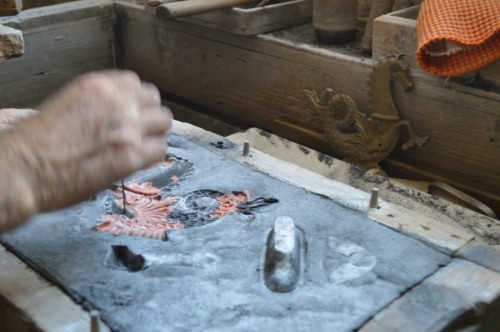 Per prendere limpronta del modello delloggetto da realizzare, in questo caso un cavallo marino da gondola su una piccola base, si utilizza una staffa riempita di terra di Fontainebleau ben pressata sulla quale il modello viene delicatamente appoggiato e poi fatto affondare leggermente con laiuto di un mazzuolino di legno perché deve andare metà sopra e metà sotto. Si collocano poi due forme, una per il cavallo e una per la base, per ricavare la traccia dei canali di colata che servono per portare allinterno della staffa lottone liquido. Si spolvera uniformemente tutta la superficie con polvere di licopodio che serve per isolare in modo che il modello non si attacchi alla terra. Sui punti più lavorati del modello, come la testa e il corpo del cavallo, si pone della terra di fonderia sintetica che prende bene tutti i dettagli delle impronte. Si colloca esattamente al disopra della prima staffa, unaltra staffa e su di essa un setaccio a larghe maglie; si riempie lo spazio tra le staffe con terra di Fontainbleau, raccogliendola con una grossa sessola: la terra deve essere inumidita perché prenda consistenza, non troppo bagnata e non troppo asciutta perché se no si scioglie e deve essere ben pressata e livellata. Per far sì che penetri bene allinterno della forma si utilizza un ferro detto #incalcatòr# o #calcadòr# e poi si pressa con un mazzuolo di legno. Si passa, infine, una bacchetta di legno a sezione quadrangolare per eliminare la terra in eccedenza e livellare perfettamente la superficie. La staffa, tenuta ben pressata, viene capovolta. Si elimina, tiro via, la staffa che fungeva da base scoprendo in tal modo il modello. Si rifiniscono e ripuliscono dai residui di terra i bordi del modello utilizzando palette di vario tipo come una lancetta #lancéta cò scugèr e paletìna# che reca alle estremità un cucchiaio e una paletta e un #anséta# realizzata dallo stesso fonditore, e definita dallinformatore larma di lavoro perché con questa si fa tutto; si utilizza poi un mazzuolino in legno per sistemare bene il modello. Per verificare laltezza della terra perché se la terra si alza vuol dire che è sopra la metà, la terra non deve alzarsi e così sono sicuro che sono a metà giusta, il modello viene leggermente sollevato mediante un bastoncino di legno fissato in un apposito foro. Spolvera di nuovo polvere di licopodio, isolante, perché la terra non si attacchi. Sovrappone alla staffa così preparata unaltra staffa, identica per dimensioni, e procede a riempirla di nuovo con la terra di Fontainebleau seguendo la stessa procedura descritta in precedenza, in modo tale da imprimere limpronta della restante superficie del modello. La forma composta dalle due staffe viene capovolta. A questo punto si può procedere allapertura, scomposizione, delle due staffe che recano impressi a specchio i due lati del modello.