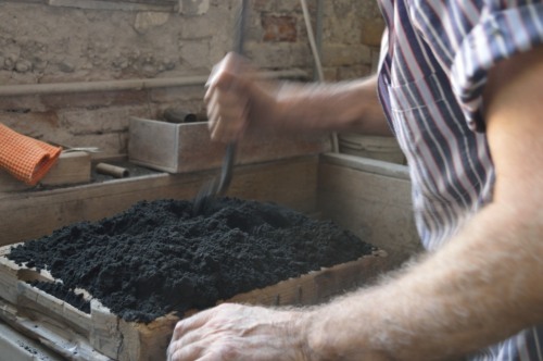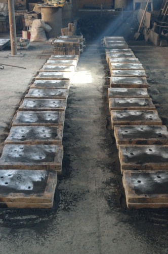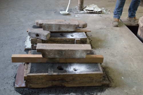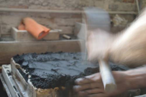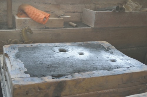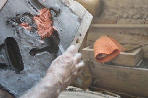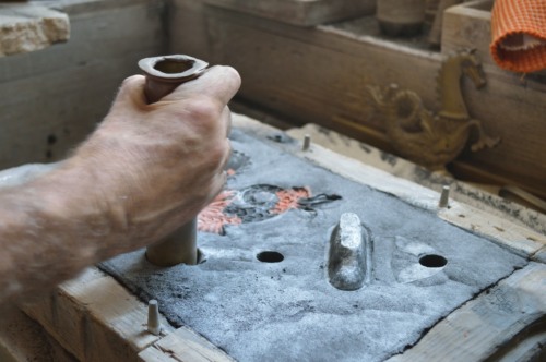 Il modello viene rimosso con estrema delicatezza, dopo aver bagnato con acqua la terra tutto intorno ad esso in modo che, quando viene sollevato mediante un bastoncino fissato entro un apposito foro del modello che lesecutore provvederà poi a richiudere , la terra resti ferma e dopo aver dato piccoli colpi sul modello con un piccolo mazzuolo di legno. Con le #anséte# si creano i canali di alimentazione: si libera il percorso che deve fare lottone per alimentare la base e si apre perché lottone possa entrare dentro e alimentare il cavallo. Realizza poi con un lungo e sottile strumento metallico a forma di spillo un respiro, uno sfiato, perché quando lottone entra se forma dei gas, escono. Sul lato interno della staffa superiore realizza, con lausilio di strumenti di diametri diversi dal più piccolo di circa 2-3 cm al più grande di circa 4 -6 cm su cui batte con il mazzuolo di legno, tre fori, due più piccoli e uno più grande. I fori sono di dimensioni variabili e proporzionati al pezzo da alimentare perché più #grando# è il pezzo più #grando# deve essere il foro, questo serve a dare pressione e fare in modo che lottone spinga dentro. Liscia e pressa bene i bordi dei fori perché la terra deve essere compatta in quanto quando entra il getto dottone non deve portare via la terra se no sono tutte impurità, sporco, che va dentro lottone. Attraverso uno dei fori lottone fa un percorso allinterno, detto canale di colata, e va ad alimentare il cavallo; una altro foro va ad alimentare la base. Il foro più grande viene evidenziato con un segno circolare in modo che sia meglio riconoscibile durante la fase della fusione. Le due staffe, ormai pronte, vengono poste luna sullaltra, facendone combaciare i perni di legno di riferimento con i fori corrispondenti, e chiuse pressandole con forza. Sui fori di alimentazione viene spolverata polvere di licopodio per renderli più evidenti. A questo punto si può procedere alla fusione; le staffe possono essere aperte dopo 15-20 minuti per effettuare la sformatura dei pezzi.