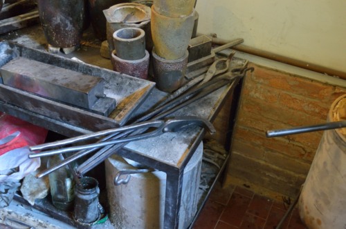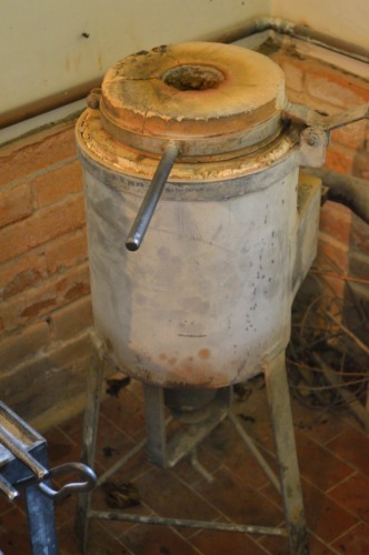 La fusione è, insieme alla battitura, la fase più delicata dellintera lavorazione ed è necessaria unattenzione estrema soprattutto quando si fanno le fusioni di leghe speciali ottenute con laggiunta di argento o rame. Ogni battiloro ha il suo segreto nelluso delle materie prime, anche perché nessuno ti dice niente. Il crogiolo che viene utilizzato è in grafite ed è posto allinterno di un fornetto alimentato a metano dove si raggiungono i 1700° necessari per arrossare il crogiolo, mentre per fondere loro è necessaria una temperatura di 1080°. Per purificare loro, al contrario di quanto avveniva in passato utilizzando il borace, lacido borico in polvere, linformatore ricorre a una procedura ancora più antica, la ricottura, eseguendo più volte la fusione. Oltre al crogiolo, lattrezzatura comprende diversi tipi di tenaglie munite di ganasce adatte a prendere i crogioli e riversare il metallo fuso negli stampi, e guanti per proteggersi dal calore.