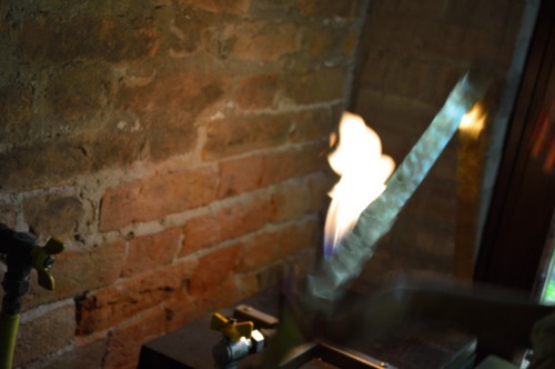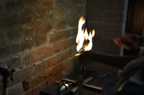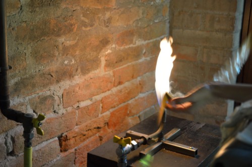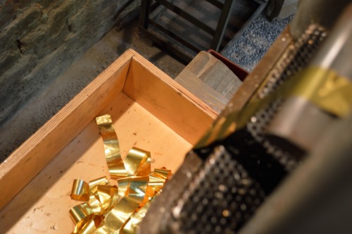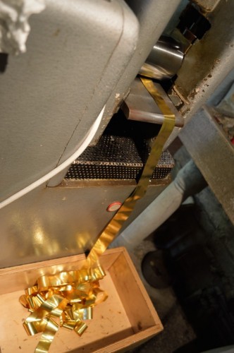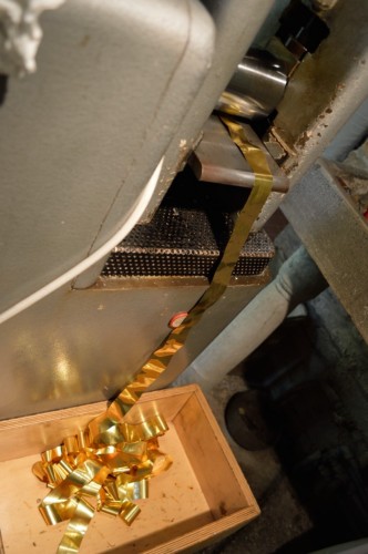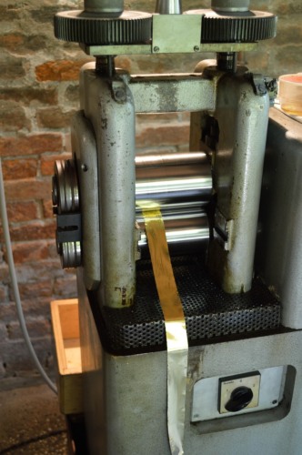 Il lingotto, ottenuto mediante la fusione del metallo cui si aggiungono i residui della lavorazione successiva della foglia doro, viene passato dapprima tra i rulli del laminatoio tante volte fino a che si ottiene un nastro sottile quanto la carta. Prima di passarla tra i rulli, la lamina viene spalmata dolio così da ridurre lattrito. Nella seconda fase, la striscia doro viene passata direttamente sulla fiamma, perché, giunti a una certa sottigliezza, la molecola delloro si deforma, è quindi necessario passarlo di nuovo sul fuoco per riscaldarlo e poi procedere ad allungarlo ulteriormente. Si procede in questo modo per tre, quattro volte in successione.