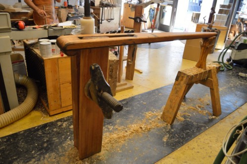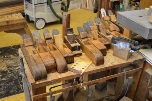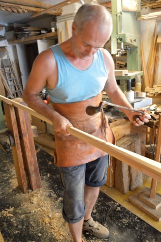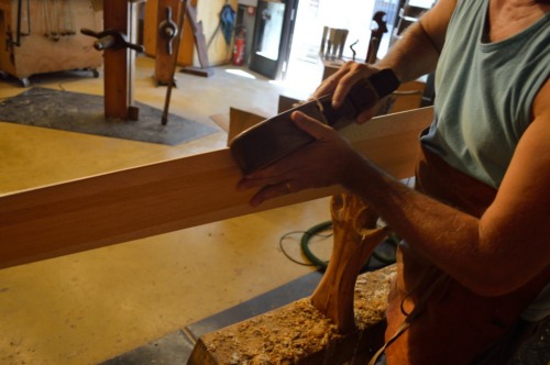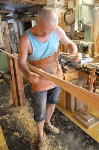 Altri cambiamenti iniziano già negli anni Trenta, Quaranta del Novecento, quando la #dolaóra# viene sostituita dalla pialla a filo e dalla sega, la sgrossatura si effettuava a macchina portando a misura perfetta il pezzo che poi si finiva a mano. Oggi si utilizzano anche piallette più leggere per asportare sottili strisce di legno, mentre il mio maestro era contrario a queste macchine utensili, queste lavorazioni si facevano con il piallone, detto #soramàn# e con le pialle di vario tipo che hanno il ferro più in fuori e tondeggiante per sgrossare o più a filo e dritto per finire.