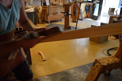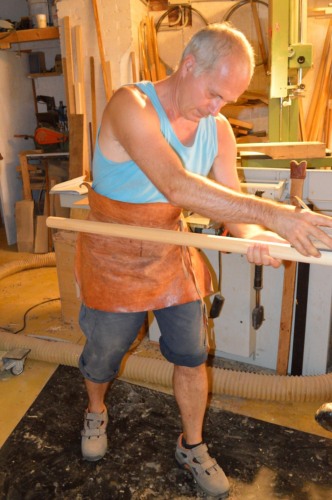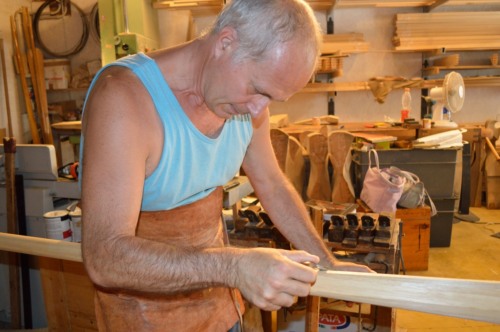 La lavorazione del remo di #ramin# si fa dalla tavola, si tracciano i due remi incrociati, si tagliano con la sega, si aggiungono i coltelli, si sgrossano e si finiscono a mano. Lartigiano sottolinea che ha apportato uninnovazione a tale procedura, in particolare, poiché larrotondamento del #girón# comporta una lavorazione piuttosto lunga, ha iniziato a tagliare le tavole, le ha rettificate e poi calibrate con la pialla a filo, in modo da avere diversi calibri per diversi remi. Questi prismi possono essere sbozzati con una fresa a quarto di cerchio. Vi è, comunque, ancora una lunga fase di lavoro che viene eseguita a mano, soprattutto la parte conica dal remo, che non può essere realizzata a macchina. Con questa innovazione la procedura di lavoro è più veloce e consente al legno una fase di assestamento. Anche questa prassi, tuttavia, è oggi diventata di difficile attuazione in quanto la mancanza di tavole grosse di #ramin# lha resa più difficile. Per questa ragione cè un ritorno alla lavorazione a mano.