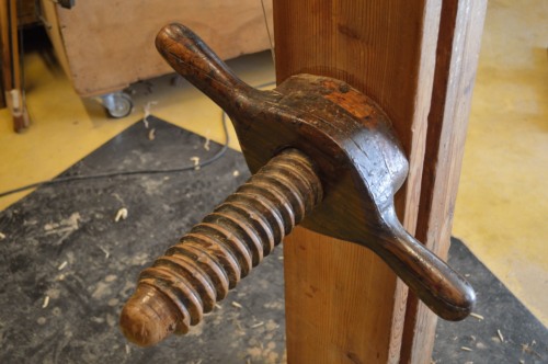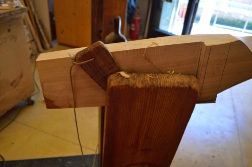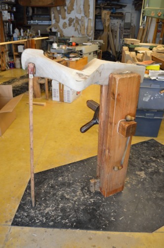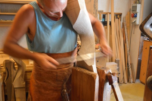 Dopo la "sbozzatura" a macchina si continua il lavoro con l'ascia, che viene impugnata con una mano mentre un'altra persona tiene fermo il pezzo. Questo strumento, dal peso di circa 2 kg, non viene più utilizzato dagli altri #remèri# attivi a Venezia, mentre l'informatore continua ad utilizzarla "perché mi piace ancora usare questo strumento". La lavorazione prosegue sbozzando ulteriormente il pezzo e praticando altri tagli con la sega a telaio così da avvicinarsi al momento di applicare il ferro a due manici, un ferro arcaico che veniva usato in molti mestieri. Carli, il suo maestro, sosteneva che si trattasse di "feri da caradòr". Il "remèr" ne possiede numerosi con lame di diverse larghezze a seconda del tipo di curva da eseguire. L'acquisizione della tecnica necessaria ad utilizzare questo attrezzo richiede molto tempo: all'inizio si presenta come una salita ripida perché non si sa bene come regolare la forza. Per svolgere al meglio la sua funzione, la lama, di acciaio forgiato a mano dal fabbro, deve essere molto affilata. Con questo strumento, chiamato "raspa", anche se in realtà è uno strumento da taglio, si effettua la fase di lavorazione detta #sgrosso# che, via via, diventa sempre più raffinato.