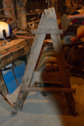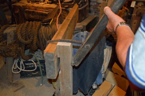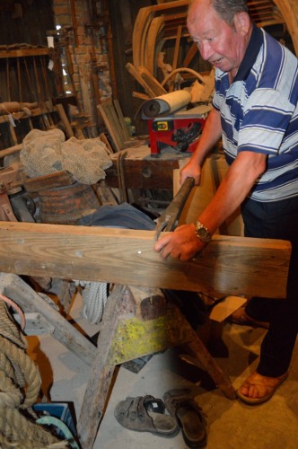 Per curvare il legno si usavano canne di palude, acqua e creta perché mantiene il caldo e non brucia il legno: Per curvare un asse di legno si poneva unestremità entro un attrezzo di forma triangolare, detto #càvria#, fissandola da un lato e legandola dallaltra parte a un pezzo di legno fissato a terra che ha la funzione di sostegno. Questo sostegno deve essere posto a una giusta distanza né troppo vicino né troppo lontano e per calcolare la curvatura si utilizza una sagoma. A questo punto si riscalda il legno con il fuoco prodotto dalle canne di palude e si tira a poco a poco la corda, ci si aiuta mettendo in fondo allasse un piccolo peso. Per fare questo giro, detto #pieto#, per la curvatura da poppa non si può utilizzare la cima dellalbero ma bisogna mettere la radice; per la curvatura da prua, si fa un giro più dolce, una curvatura più leggera. Per fare questa operazione ci vuole molta pratica. Adesso al posto delle canne di palude che non si trovano più si usano bombole a gas. Una volta fatta questa curvatura, lasse deve essere fissato allo scafo immediatamente; se dovesse esserci qualche problema è necessario scaldare di nuovo il pezzo.