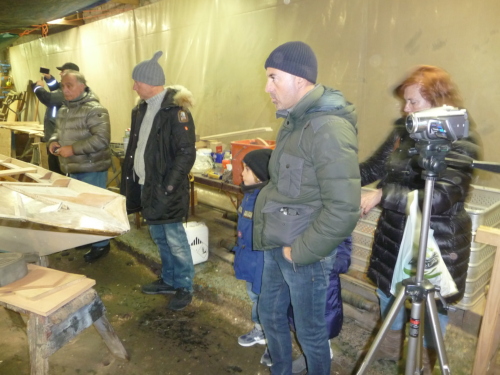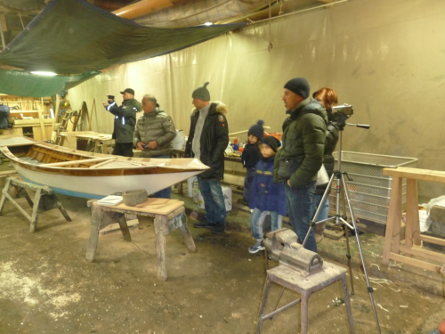 Sullo sfondo Matteo Tamassia sta lavorando ad una imbarcazione, condividendo lo spazio dello squero per sue attività di piccola cantieristica marinara. La compresenza di più artigiani all'interno dello squero, oltre ad ottimizzare le spese del suolo veneziano sempre molto alte, è funzionale anche ad aiuti estemporanei per operazioni fisicamente impegnative.