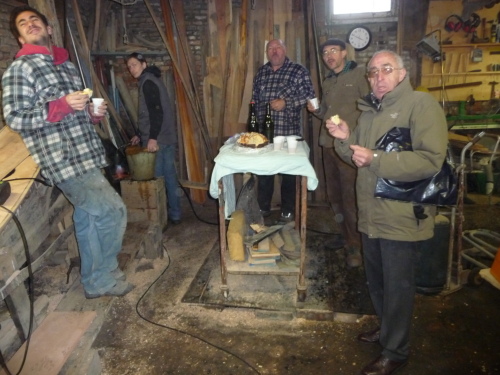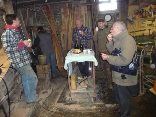 Una voce proveniente fuori campo chiede Mateo se finìa a sopressa? ricordando come lo squero è luogo di lavoro ma anche di socialità. È usuale infatti che clienti e amici vengano in visita, magari per dare una occhiata a una imbarcazione (propria o di conoscenti o parenti) in costruzione, portando libagioni (dobbligo il vino oltre a qualche tipo di companatico) da consumare in loco.