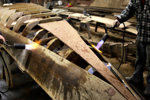Roberto Tramontin passa una fiamma alimentata a gas sul #sercio# di sinistra in modo da scaldarlo e ammorbidirlo. Contemporaneamente spruzza anche dell'acqua per inumidire il legno ed evitare che bruci. I #serci# sono le prime due tavole messe in opera sul #cantier#, avviando così la gondola. Sono ottenute ciascuna da una tavola di rovere. Essendo state inizialmente solo fissate provvisoriamente, ora devono essere torte per farle aderire alle ordinate. Dunque per piegarle e adattarle alla costolatura #corbe# viene usato il calore assieme a dei morsetti.