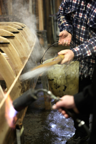 L'operazione di torcitura del #sercio# richiede tempo. Roberto Tramontin da seduto procede a scaldare, tramite fiamma alimentata a gas, la tavola che deve essere fatta aderire e quindi fissata alla costolatura. Contemporaneamente a intervalli regolari spruzza il legno con dell'acqua per evitare che si bruci. Man mano che il legno si scalda e quindi si ammorbidisce, lartigiano. aumenta l'avvitatura dei morsetti che piegano la tavola. In passato per questo tipo di operazione erano impiegate delle canne palustri che sembra bruciando fornissero un caldo umido e non violento adatto ad ammorbidire il legno senza seccarlo ne bruciarlo. Alcune di queste canne sono ancora conservate nello squero stivate tra le travi del soffitto.