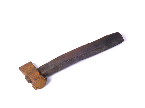 Massello costituito da una testa e una bocca tagliente. La testa è piatta e di forma quasi circolare, con bordi dilatati e fortemente slabbrati. Nel tratto centrale del massello è stato praticato un occhio in cui è inserito un bastone, annerito dall'uso, che funge da manico. Il massello nel tratto compreso tra la testa e l'occhio è squadrato e con gli spigoli smussati; il tratto compreso tra l'occhio e la bocca va assottigliandosi verso quest'ultima fino a formare una parte tagliente il cui filo è verticale rispetto all'asse orizzontale di simmetria dell'occhio. Il bastone è di forma rettangolare con angoli arrotondati e va assottigliandosi nel tratto in cui è inserito nell'occhio da cui sporge poco meno di un centimetro.Notizie storico-critiche