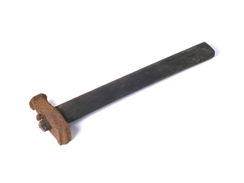 Massello costituito da una testa e una bocca con sagoma per stampo. La testa è piatta e di forma quasi circolare, con bordi dilatati e fortemente slabbrati. Al centro del massello è stato praticato un occhio in cui è inserito un bastone, annerito dall'uso, che funge da manico. Il massello è costituito da un corpo squadrato con spigoli smussati, il tratto centrale, di spessore maggiore rispetto ai lati, va restringendosi verso la testa. Il tratto compreso tra l'occhio e la bocca è leggermente concavo e aumenta di spessore all'altezza della bocca. La bocca è a sezione rettangolare ed ha la superficie percorsa da due curve concave e una convessa centrale poste orizzontalmente rispetto all'asse veritcale di simmetria dell'occhio. Il bastone, è di forma rettangolare con angoli arrotondati e va assottigliandosi nel tratto in cui è inserito nell'occhio da cui sporge di pochi millimetri.Notizie storico-critiche