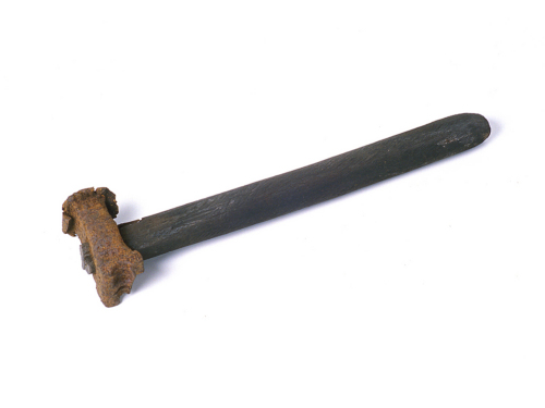 Massello costituito da una testa e una bocca con sagoma per stampo. La testa è piatta e di forma quasi circolare e con bordi dilatati e fortemente slabbrati. Al centro del massello è stato praticato un occhio in cui è inserito un bastone, annerito dall'uso, che funge da manico. Il massello è costituito da un corpo centrale squadrato con spigoli smussati che va leggermente diminuendo di spessore nel tratto prossimo alla testa. Il tratto compreso tra l'occhio e la bocca ha la superficie delle facce verticali leggermente concava e aumenta di spessore all'altezza della bocca. La bocca è a sezione rettangolare e ha la superficie percorsa da una concavità che si sviluppa orizzontalmente rispetto all'asse veritcale di simmetria dell'occhio. All'interno della concavità sono state incise delle scanalature ad essa ortogonali, profonde poche millimetri, di cui una a sezione quadrata e l'altra di forma indefinibile per la mancanza di un parte della bocca.Notizie storico-critiche