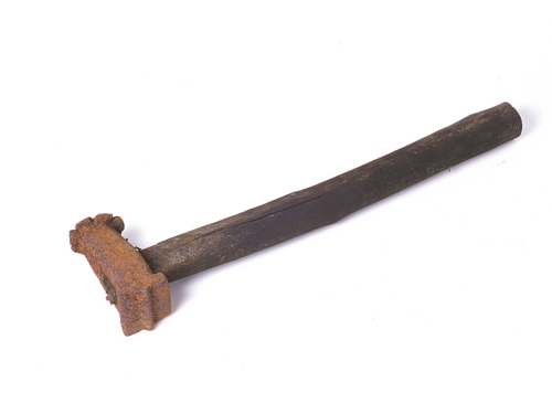 Massello costituito da una testa e una bocca con sagoma per stampo. La testa è piatta e di forma quasi circolare, con bordi dilatati e fortemente slabbrati. Nel tratto prossimo alla bocca è stato praticato un occhio in cui è inserito un bastone, leggermente curvo e annerito dall'uso, che funge da manico. Il massello è costituito da un corpo squadrato con spigoli smussati che va leggermente aumentando di spessore verso la bocca dove si allarga ulteriormente. La bocca, a forma di quadrilatero, è percorsa al centro da un corpo sporgente a sezione triangolare che si sviluppa in senso orizzontale rispetto all'asse verticale di simmetria dell'occhio. Il bastone, che è percorsao da una fenditura verticale nel tratto superiore, ha sezione rettangolare con angoli arrotondati e va assottigliandosi nel tratto in cui è inserito nell'occhio da cui sporge di pochi millimetri.Notizie storico-critiche