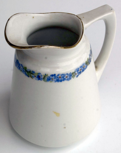 recipiente di porcellana bianca di forma cilindrica rastremata; il diametro della base è circa 4/5 di quello maggiore; recipiente dotato di manico laterale sporgente, costituito da due segmenti, quello superiore piatto e quello inferiore curvo; sul lato opposto sporge dall'imboccatura, lateralmente e verso l'alto, un largo beccuccio; decorazione dipinta costituita da una linea dorata sul manico e lungo il bordo superiore e da una fascia floreale (fiori azzurri e foglioline verdi) realizzata sotto il bordoNotizie storico-critiche