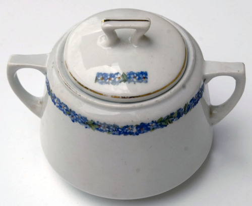 recipiente in porcellana bianca, di forma cilindrica leggermente rastremata; il diametro della base è circa 4/5 del diametro maggiore; il contenitore è dotato di due manici laterali sporgenti formati da due segmenti, quello superiore piatto e quello inferiore curvo; nell'imboccatura superiore si incastra il coperchio rotondo, leggermente convesso, dotato sulla sommità di manico sporgente "a ponte"; decorazione dipinta costituita da linee dorate e motivi floreali (fiori azzurri e foglioline verdi), realizzati sia sul contenitore, sotto il bordo, che sul coperchioNotizie storico-critiche