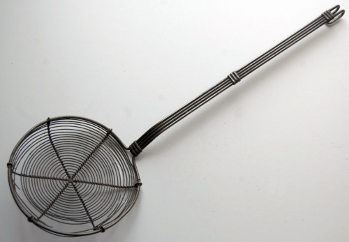 utensile fatto con filo di ferro di dimensioni differenti, costituito da un manico con estremità ad uncino e da una paletta circolare; il manico è costituito da 4 fili di ferro fissati, alle estermità e al centro, da tre fascette orizzontali composte da tre fili di ferro della stessa grossezza; i fili esterni del manico si allungano sia all'estremità superiore, a formare il gancio ad uncino, che all'estremità inferiore, a formare la circonferenza della paletta; alla circonferenza sono agganciati i fili di ferro che formano sei raggi incrociati al centro della paletta, attorno i quali è attorcigliato un filo di ferro più sottile disposto in file concentriche che formano la trama della palettaNotizie storico-critiche
