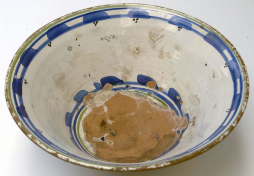 recipiente di forma circolare con bordo alto svasato e spigolo arrotondato; il diametro del piede è circa un terzo del diametro del bordo superiore; in terracotta smaltata allinterno di bianco e rivestita allesterno di gesso. Decorazione interna dipinta, costituita da motivi geometrici e linee di colore azzurro, verde e nero.Notizie storico-critiche