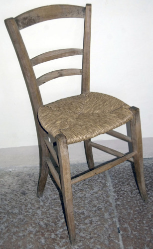 legno di acacia (sgrossatura/ rifinitura/ tornitura/ fissaggio ad incastro/ fissaggio con chiodi/ verniciatura) / paglia (intreccio) / ferro (sagomatura a stampo industriale)