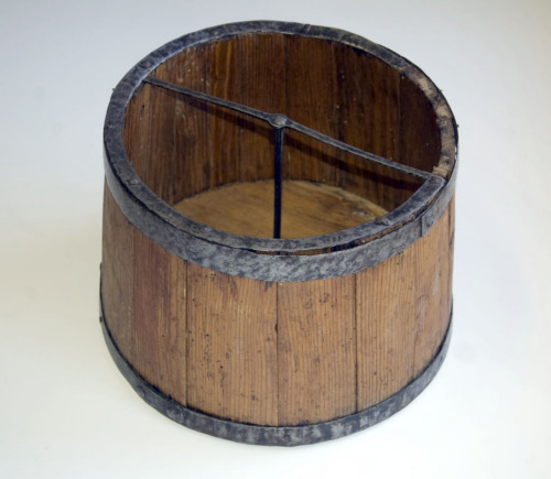 recipiente in legno a doghe (16), di forma leggermente troncoconica, chiuso sul fondo da un disco in legno incastrato all'interno delle doghe; dotato di due cerchi esterni di rinforzo in ferro, fissati con chiodi lungo i bordi inferiore e superiore; dal centro del fondo parte un'asticella di ferro che, all'altezza del bordo superiore, si unisce ad una traversina piatta sempre di ferro che funge da impugnatura, le cui estremità poggiano sul bordo superiore e sono fissate con chiodini di ferro; sul bordo superiore del recipiente poggia infine una lamierina di ferro di rinforzo, fissata con chiodi lungo tutta la circonferenzaNotizie storico-critiche